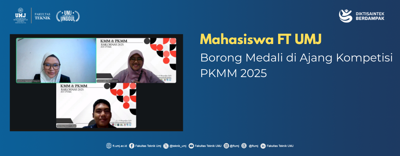 Mahasiswa Fakultas Teknik Universitas Muhammadiyah Jakarta (FT UMJ) berhasil memborong medali pada ajang Kompetisi Mahasiswa Muhammadiyah (KMM) dan Program Kompetisi Mahasiswa Muhammadiyah (PKMM) Tahun 2025. Kompetisi yang digelar secara hybrid ini berlangsung di di Universitas Muhammadiyah Jember pada 12–15 November 2025.
