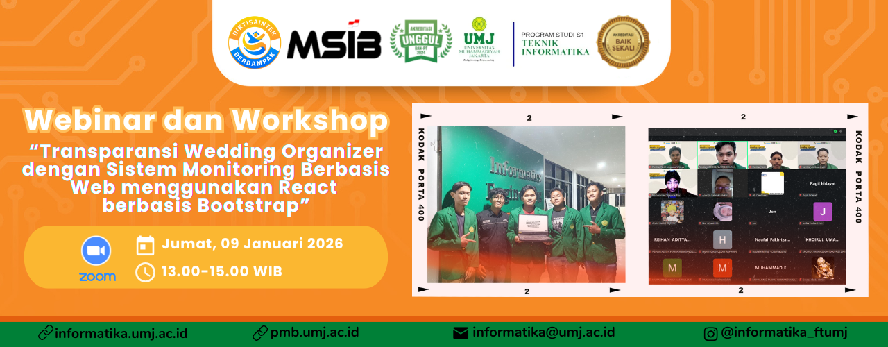 Pada Jumat, 09 Januari 2026, telah dilaksanakan kegiatan Webinar & Workshop dengan tema “Transparansi Wedding Organizer dengan Sistem Monitoring Berbasis Web menggunakan React berbasis Bootstrap”. Kegiatan ini merupakan bagian dari rangkaian diseminasi hasil Program Magang dan Studi Independen Bersertifikat (MSIB) Batch 9 yang diselenggarakan oleh Program Studi Teknik Informatika, Fakultas Teknik, Universitas Muhammadiyah Jakarta (UMJ). Pelaksanaan kegiatan ini diinisiasi dan dikelola oleh Tim Diseminasi KKN Kelompok 7 sebagai bentuk kontribusi akademik dalam pengembangan kompetensi teknologi web modern.