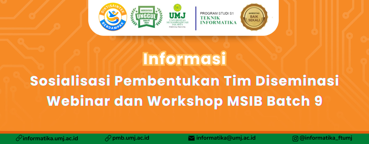 Diinformasikan Kepada seluruh mahasiswa Magang Berdampak/ MSIB Batch 9 Prodi Teknik Informatika FT UMJ diwajibkan hadir Kegiatan Sosialisasi Pembentukan Tim Diseminasi Webinar dan Workshop MSIB pada: